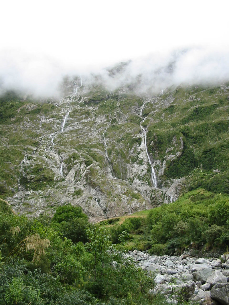 A couple hours in, I finally started seeing some neat stuff. The path winds through a steep valley, following alongside a stream. The water in the stream was some of the clearest freshwater I’ve seen. There were huge trout swimming inside and they were as clear as goldfish in an aquarium. All the fishermen on the trek were jumping up and down about getting in there and catching them. Anyway, it was pretty. And there were countless little cascading waterfalls running down the cliffs on either side of the valley, feeding into the river. I love cascading waterfalls. I am a cascading waterfall junky.