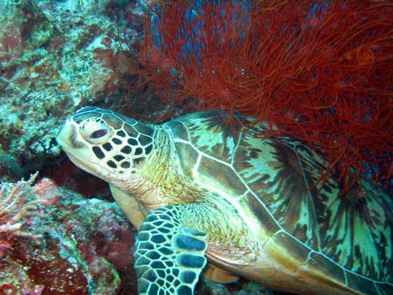 Sipadan sells itself as one of the world’s top five dive sites, and in their more enthusiastic literature they claim to be #1. They are safe in that claim only because it’s a completely subjective assertion. To be honest, I didn’t think the diving was all that spectacular. Aside from the unique shape of the island, which was very cool, most of what was on display was fairly typical for the Asia-Pacific region. There were lots of green sea turtles and white-tip reef sharks, which are fun to see, but not at all uncommon. The corals and smaller fish were beautiful, but for me that stuff doesn’t make a dive memorable.