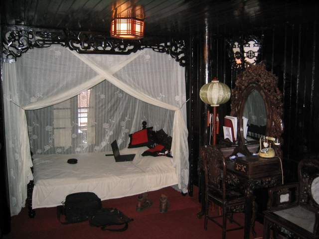 I’m in room 206 of the Vinh Hung hotel in Hoi Ann, the room Michael Caine stayed in while he was here shooting The Quiet American. It’s decked out in antique French colonial furniture, complete with a great big four-poster bed in the corner. After months of cheap, bland hotels, it’s a nice change of pace.