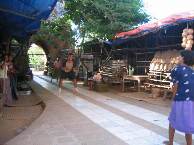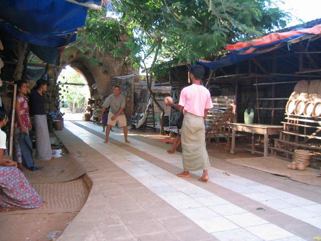 I left Tom at one point so he could hang around inside one of the pagodas and photograph the frescos. They don’t sustain my interest nearly as long as they do for him, which makes sense, seeing as he spent years studying Buddhist art history and all. I lay down out front near the souvenir stalls. The sellers pestered me for a while, but eventually realized it was useless and went back to entertaining themselves as if I wasn’t there. They pulled out a ball made of woven strands of wood and played a game that was immediately recognizable as monkey-in-the-middle. They invited me to play, and we had a gay old time for about half an hour.
