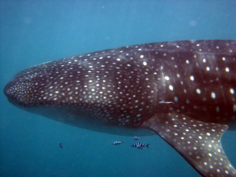 There are a few seconds of bubbles and disorientation with backward entry. You right yourself, adjust your mask, and see what’s in front of you. In this case it’s a 5 meter whale shark — a baby. Still, my heart pounds and I have to catch my breath through the snorkel. If the thing had teeth, it would be the most terrifying image I’ve ever seen. Pretty soon its too much. I stick my head up and take some deep breaths. I see Ian and Jean Claude on the Zodiac and all I can think to shout is "Big!" They laugh.