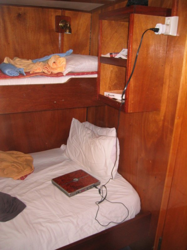 The ship itself is already enjoying its retirement. An oceanographic research vessel built in Hamburg and used in the North Sea, it can take a lot more abuse than this region will likely throw at it. At fifty years, it still has its original engine — that’s German engineering for ya. They refitted the hull with seven spacious wooden cabins; each includes a full bathroom and a nifty porthole, and conveniently matches my laptop.