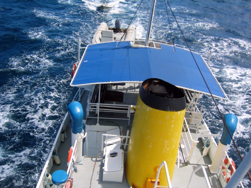 The dive deck was modified for commercial use, and the crane was moved to the third floor sun deck, where it holds two dinghies for trips to shore, dive sites, and for our current purpose of chasing whale sharks.