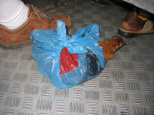 Taking my seat on the bus, I nearly stepped on a small plastic bag by my feet. On closer examination, I found it contained a live chicken.