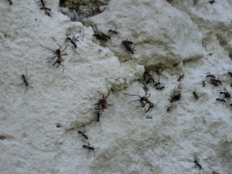 A marching line of these ants moved all the way up from ground level to the summit of one temple; a vertical rank hundreds of feet tall. The operation was supervised at checkpoints by ferocious-looking soldier ants, several times larger than the workers, with massive chompers. I managed to get bitten by one on the way up. It hurt.