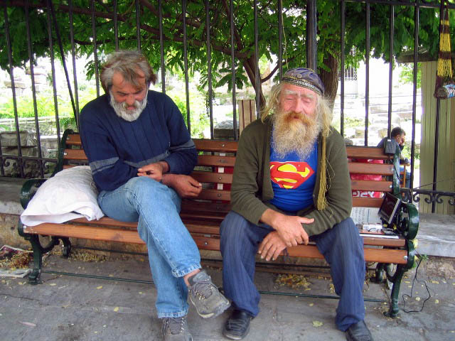 The sun goes behind some clouds, so I sit down on the bench, pull out my Sudoku book, and I wait for it to come out again. A short guy in a black leather jacket sits next to me. He pulls out a scratchy AM receiver and starts blasting some Greek talk radio, absolutely crushing my moment of serenity.