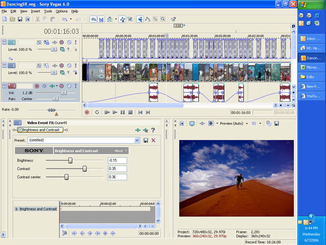 I’ve switched to a new piece of editing software called Sony Vegas. Up to now I’ve been using the crude-but-free tools that came with my camera, so it’s a revelation. Spent all of yesterday learning how to use it. Stuff that used to take me hours now takes minutes and I’m free to play around more with structure and timing.