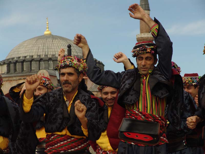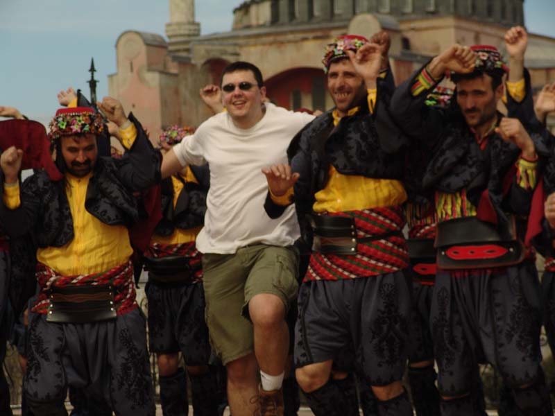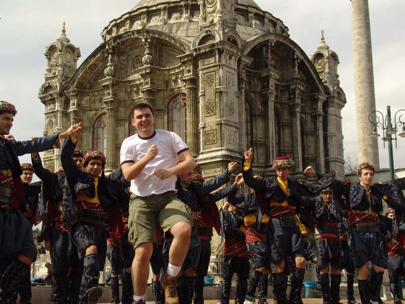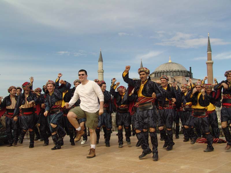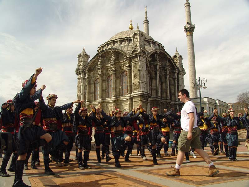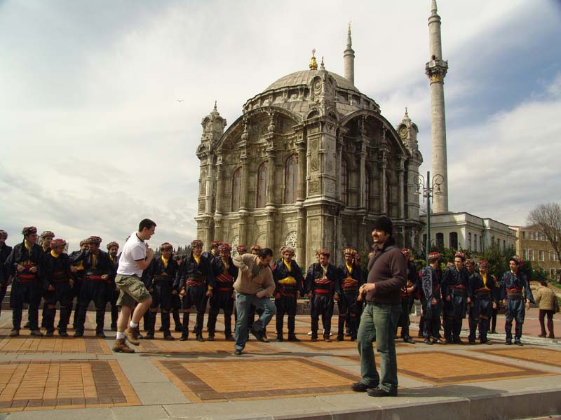 Was taken to an old mosque on the shores of the Bosporus with a large, open plaza at the base. We sat in a café and ate breakfast while 50 Turkish men donned traditional folk dancing costumes around the corner.