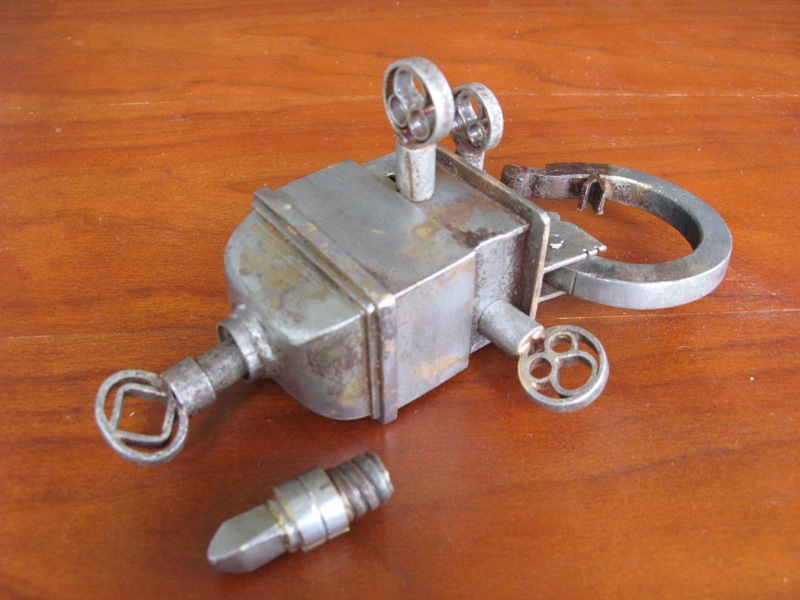My friend, Pete, did some research, and found out it’s a 15th century design, possibly Indo-Persian. He also found a disturbing warning that there are inauthentic fakes floating around. I suppose it’s likely my lock isn’t more than a couple decades old, but it’s still a lot of fun to play with and to watch other people try to solve.