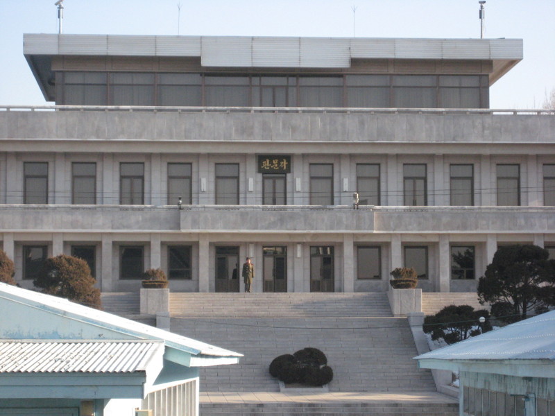 This is the building on the North Korean side of the DMZ. You can see a teeny tiny man at the top of the steps. Here’s a better shot.