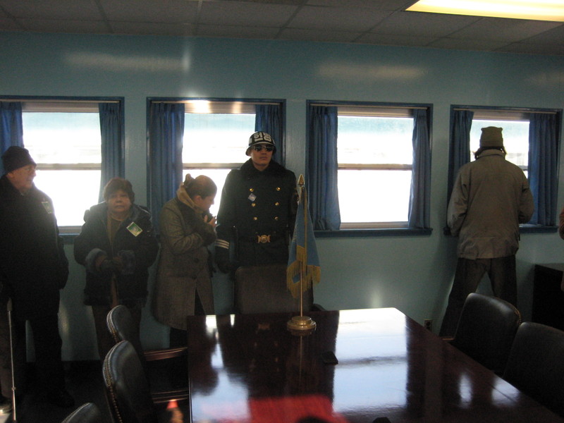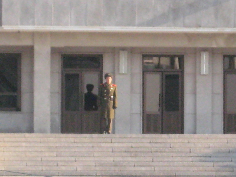 This was taken inside the meeting room. The border runs along the center line of the table and between the legs of the South Korean guard. He is frozen in a modified Taekwondo stance designed for immobility. Visitors are instructed not to touch him and not to walk between him and the table. However, you can cross the border on the other side of the table and wander around in about 100 square feet of what is technically North Korea. Another South Korean guard is posted in front of the door leading out into North Korea.