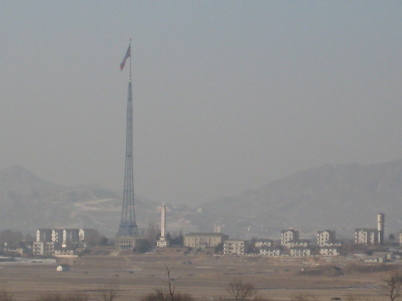 What you’re looking at there is the tallest flagpole in the world. Mounted atop it is the second largest flag in the world (the biggest is apparently in Maryland). It stands in the center of Kjong-dong, a city near the border on the North Korean side. We were able to see it from a hilltop viewing station that offers a pretty substantial glimpse into the country.