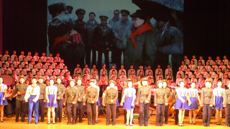 Taking in the big show at the Children's Palace in Pyongyang; a dazzling spectacle of kids on parade below projected footage of Kim Jong Il looking at things. I've got to hand it to him, he is totally pulling off that red scarf.